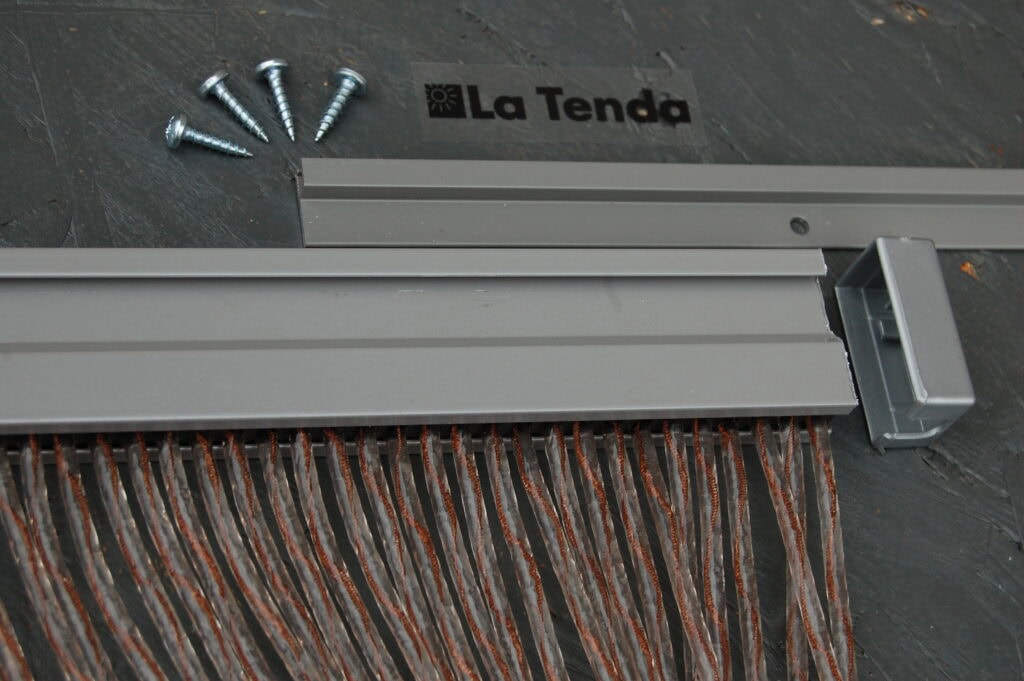 Mit dem La Tenda MERANO 1 Türvorhang (140 x 230 cm) halten Sie lästige Fliegen und andere Insekten im Sommer draußen, wenn Ihre Terrassentür offen steht. Dank des gedrehten braunen Fadens im Inneren der transparenten PVC-Schnur gehört dieser Fliegenvorhang zu unseren Bestsellern. Mit 170 Schnüren pro Meter schließt der MERANO 1 die Türöffnung sicher ab. Der Türvorhang verfügt über ein robustes, grau beschichtetes Aluminium-Oberprofil. Ein kostenloses h-förmiges Aluminium-„Stuhl“-Profil zur einfachen Montage am oder über dem Türrahmen ist ebenfalls enthalten. Schrauben sind auch im Lieferumfang enthalten.