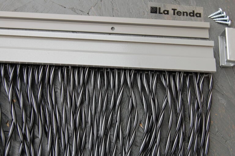Met La Tenda deurgordijn PADOVA 3 90x210cm houdt u irritante vliegen en andere insecten buiten de woning wanneer in het zomerseizoen de tuindeur open staat. Een modern en degelijk vliegengordijn in een ‘zwart met grijs’ gedraaide vorm. Het sluit goed af en laat weinig licht door. 170 koorden per meter. Een uitstekende keuze. Het deurgordijn PADOVA 3 is voorzien van een solide grijs gecoat aluminium bovenprofiel. Ook wordt gratis een aluminium h ‘stoeltje’- profiel bijgesloten voor eenvoudige montage op of boven het deurkozijn. Schroeven worden meegeleverd.