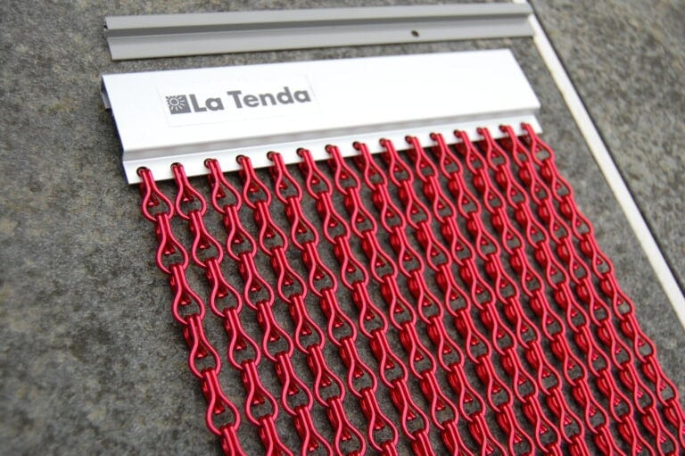 Met La Tenda vliegengordijn ALUSAX 7 in de maat 90x210cm houdt u irritante vliegen en andere insecten buiten de woning wanneer in het zomerseizoen de tuindeur open staat. Aluminium kettingen van Spaanse topkwaliteit. Geanodiseerd in de kleur rood, d.w.z. een proces dat aluminium langdurig beschermt en zo de levensduur verlengt. Kettinggordijnen zijn zeer geschikt voor restaurants, of gewoon voor in uw keuken, in de tuindeur en als room-divider. Het deurgordijn is voorzien van een solide alu bovenprofiel. Ook is een h ‘stoeltje’- profiel bijgesloten voor de montage op of boven het deurkozijn.