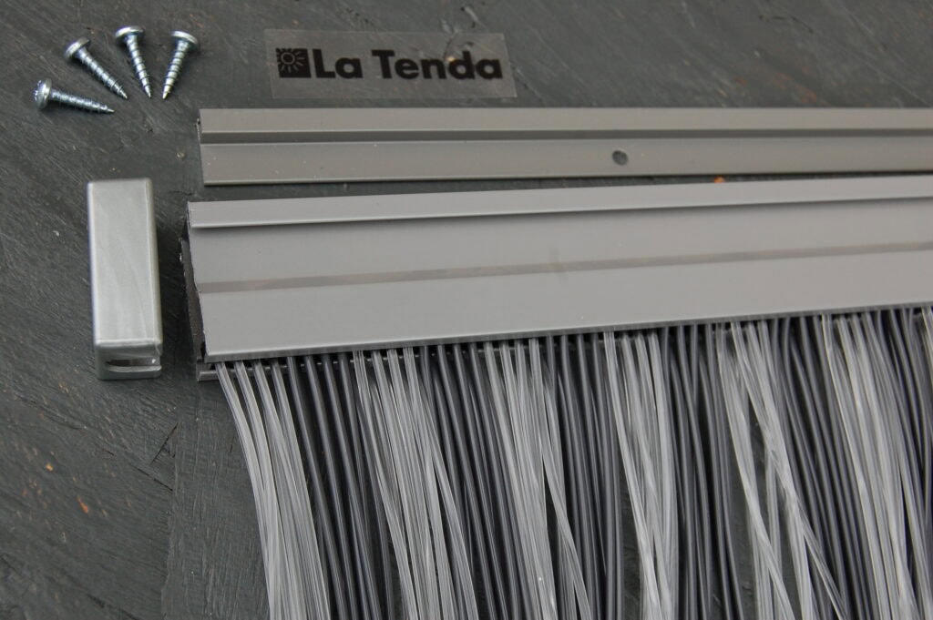 With La Tenda door curtain TRENTO 1 120x250cm you keep annoying flies and other insects outside the house when the garden door is open in the summer season. This TRENTO 1 fly curtain offers an excellent barrier against flying insects thanks to the double row of a total of 520 thin transparent and gray cords per meter. One of our bestsellers! The door curtain is equipped with a solid gray coated aluminum top profile. An aluminum h ‘chair’ profile is also included free of charge for easy mounting on or above the door frame. Screws are included.